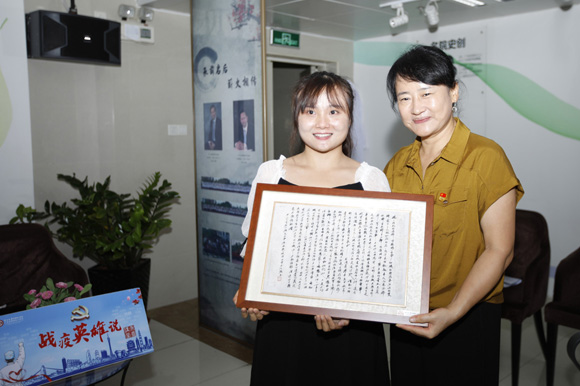 6月16日,附属第六医院党委书记李汉荣为出席“战疫英雄说”守真讲堂的抗疫代表赠送纪念框(图片来源:附属第六医院)