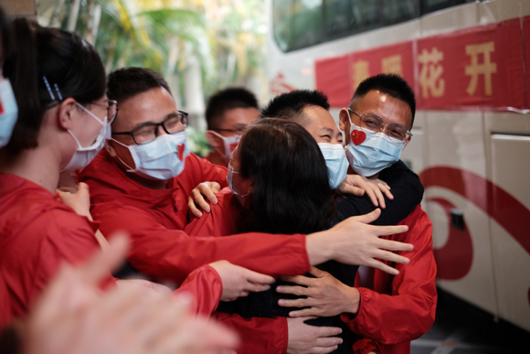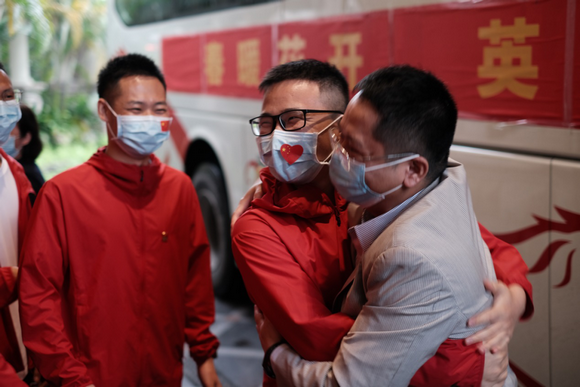 接载队员们的返程车刚停稳,在医院等候多时的家属、朋友、同事都不约而同地为队员们送上了热烈的掌声。医疗队员们挥舞着手中的小国旗依次走下车,“我们回来了!”,久违的回家感觉让队员们再也难以抑制内心的激动,纷纷与家属、朋友、同事来了个亲切的击掌、拥抱。