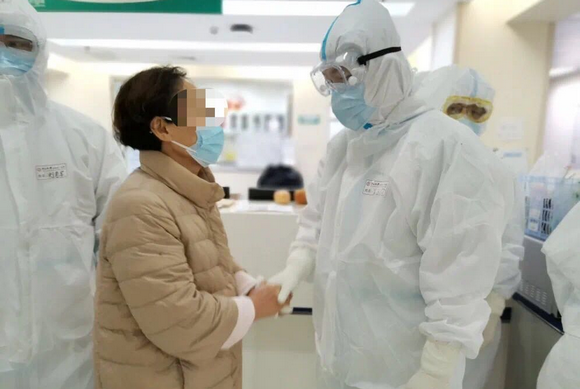 罗益锋(右)与治疗康复的武汉阿姨握手
