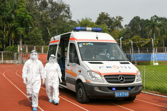 演练中,应急车转运发热患者去定点医院 记者李劲峰 摄