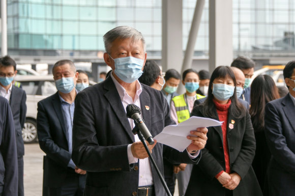 陈春声书记在讲话中代表罗俊校长和学校向医疗队表示最崇高的敬意和最真挚的问候。他指出,自疫情发生以来,我校各附属医院积极开展防控工作,承担起高水平大型公立医院应尽的社会责任,不辱使命,不负重托,无愧于“无敌中山医”这块金字招牌。今天凯旋的130多名同事,在新冠肺炎患者尤其是重症患者及老人患者救治工作中取得了显著成效。孙逸仙纪念医院185年的辉煌而荣耀的历程就是一代代逸仙人秉持医者仁心,砥砺前行的奋斗与奉献。两个月以来,大家以逸仙人的大仁大义、大爱大勇写下了光彩的一笔,孙逸仙纪念医院的史册将镌刻队员们的名字。他希望大家经过集中休整后,以更加饱满的精神状态回到工作岗位上,为夺取疫情防控和经济社会发展双胜利作出新的更大贡献。