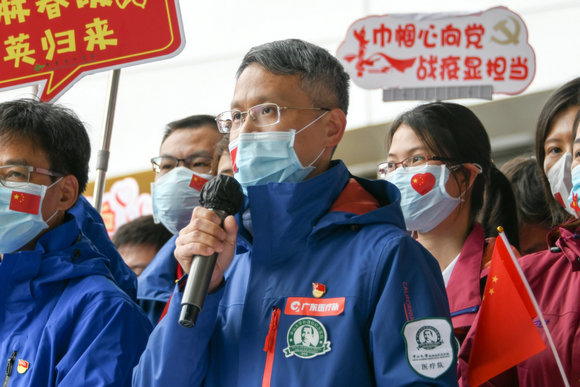 春暖花开,英雄凯旋。4月5日,我校孙逸仙纪念医院第二批支援湖北疫情防控医疗队131名队员从武汉返粤,圆满完成为期两个月的支援任务。广东省副省长张光军,广东省卫生健康委主任、党组书记段宇飞,我校党委书记陈春声,孙逸仙纪念医院院长宋尔卫院士,孙逸仙纪念医院党委书记王景峰,我校党委组织部、宣传部负责人到广州白云国际机场迎接,向队员们表示亲切的慰问并致以崇高敬意。