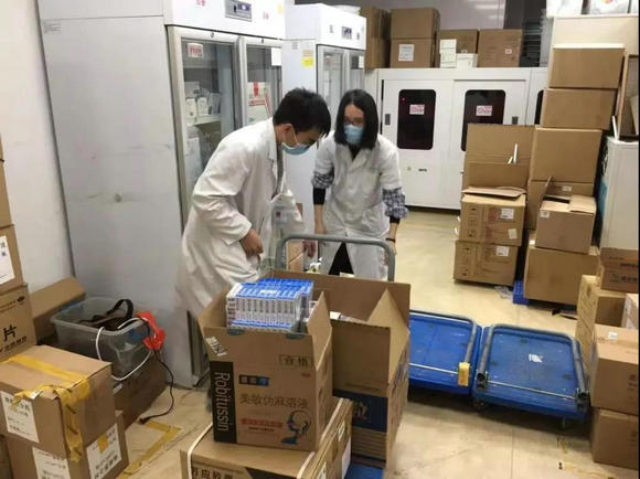 药剂科5位工作人员马上返回医院,5人按清单分类前往药库领药、搬运、按储藏条件及剂型分类打包。4个小时后,冷藏药品6箱、降压药、眼药水、喷鼻剂、中药方剂等常温药品34箱已经筹备完毕。