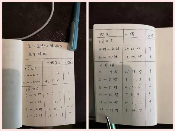 由于条件有限,正式进驻前,东莞松山湖中心医院张丽华主任手写了两张简陋的排班表,根据实际情况不断调整。队员郅敏介绍,考虑到援助工作强度,39位医生按照年龄排班,每个人都有一个编号,以年龄最大倒数顺序排位的9位为二线医生。4小时一班,每班3位一线医生,1位二线医生。交接班时,提前一个小时将医护人员从住处接去,推迟一个小时接回。“医护人员交接班均需穿好防护服再交班。一丝不苟,严格按流程进行。”