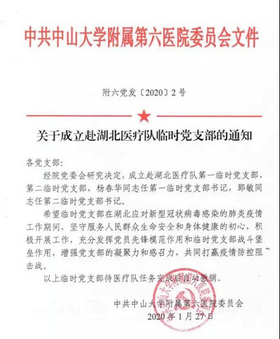 1月30日一早,广东省第二批抗疫医疗队召开全体会议,会议由副院长姚麟主持,会议上再次明确了组织架构,而战前动员令更是提升了战友们打赢这场硬仗的信心。经上级党组织批准,会上成立了第二批援鄂医疗队党总支,由姚麟任党总支书记。在党员干部的引领下,不少同志纷纷表示想火线入党,加入党组织。