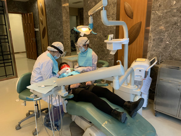 诊疗工作有条不紊。负责秩序维护工作的保安大哥来到医院大堂门口,为进入医院的病人测量体温;在预检分诊处,护理人员准备充足的手消毒液,做好患者的旅行史和接触史登记工作,完成预诊与分诊工作。保洁员对诊间和牙椅进行全面清洁和消毒工作,迎接新一批就诊患者。