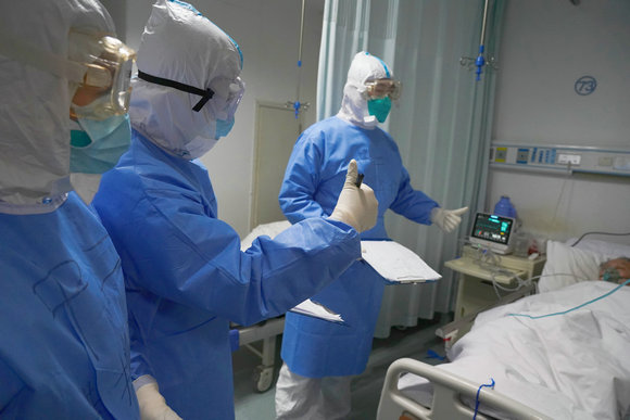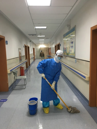 穿着多层防护服及戴着沉重护目镜的队员在清理病区卫生