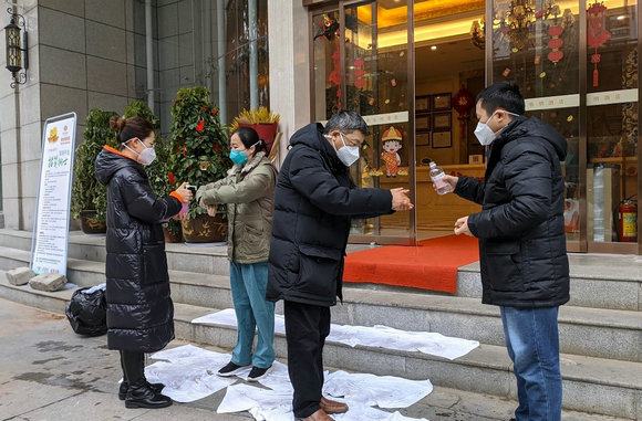 下班进入酒店前,在寒风中,队员们互相“消毒”