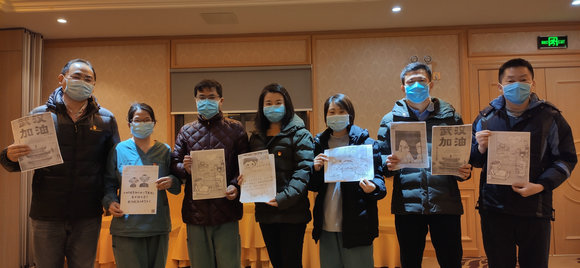 为消除队员们紧张的情绪,临时党支部组织大家利用下班时间在酒店制作漫画。“中国加油!武汉加油!”一幅幅队员绘制或打印的漫画张贴在酒店走道的墙上。酒店里紧张、不安的气氛似乎因为这些漫画的出现变得轻松、活跃起来。“小林老师”漫画创作者林帝浣老师闻讯表示要给医疗队赠送签名作品和300盒情人节漫画巧克力为医疗队加油鼓劲。