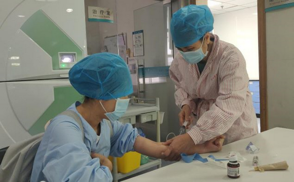 医护人员要穿着防护服进入隔离区,由于衣服的密闭性,不到一会儿,薛莹的眼镜和护目镜就都起了雾,给患者量完体温,甚至连体温计都看不清楚。她只能到窗边吹一下风,待雾气散一些之后再看。带着双层手套去给病人抽血、打针,再加上眼镜起雾,这让薛莹有些慌张,她只能尽自己最大的努力去摸血管,睁大眼睛来判断位置,扎上了,深深舒一口气,扎不上的时候满怀愧疚。