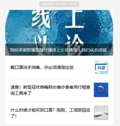 学院组织疫情防控领导小组成员学习习近平总书记关于疫情防控的指示精神,以官微作为主要宣传平台,确保消息来源可靠后进行转载,并在年级群等平台积极转发宣传,做好宣传教育和舆论引导工作。学院官微自1月29日开始发布相关推送,累计已发布疫情相关消息18篇。转发消息以官方消息和数据为准,参考人民日报、博彩平台推荐官微等官方平台,内容覆盖国家重大新闻、正面人物事迹、防护知识以及疫情最新动态等。深入宣传党中央重大决策部署,使舆论引导强信心、暖人心、聚民心;重点宣传防疫抗疫一线的感人事迹,讲好中国抗击疫情故事,展现中国人民团结一心、同舟共济的精神风貌;增强健康理念和传染病防控知识宣传教育的及时性、针对性和专业性,实时传达疫情防控进展情况,使师生放心安心。