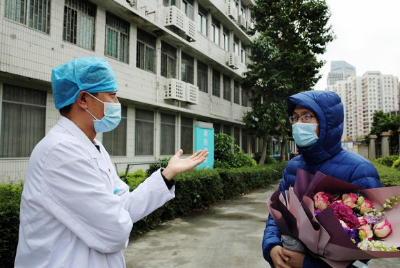 他接过了感染科护士长李莉莉、感染科隔离病区护士长陈苑莉送上的鲜花,并向身边欢送他出院的医护人员表达了深深的感谢。