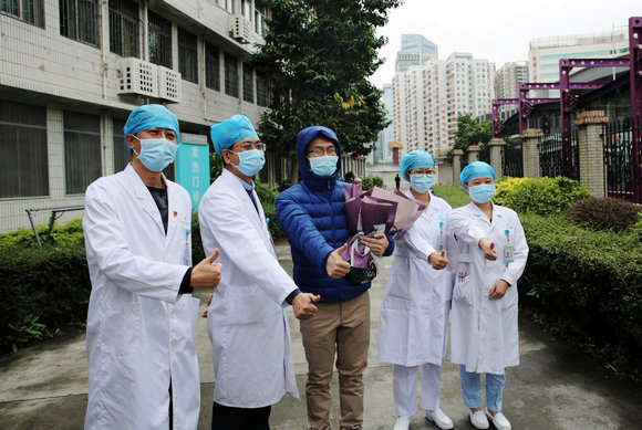 下午1点半,刘先生面带微笑、一身轻松地从住了近半个月的中山三院2号楼步出。远远地,他一眼就认出了没穿防护服、依旧戴着口罩的感染科隔离病区主任彭亮,“虽然戴着口罩,但我记得您的声音,很有感染力!”