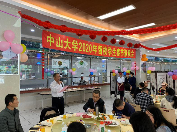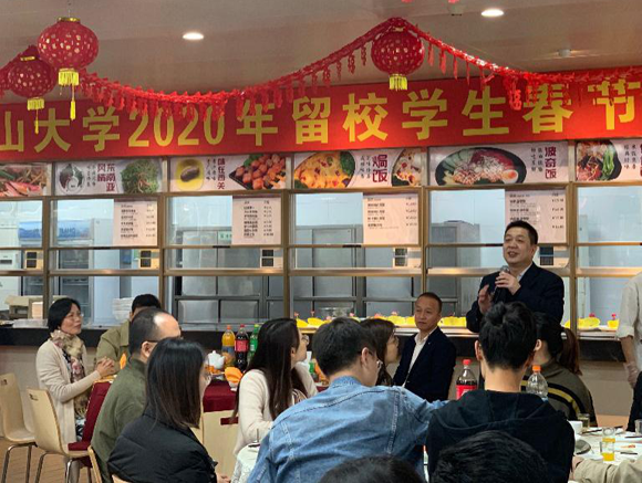 1月22日,我校留校学生新春慰问活动在广州校区各校园及珠海校区同步开展。校党委常务副书记、副校长马骏,副书记国亚萍,副书记余敏斌,副校长杨清华四位校领导分别赴广州校区南校园、东校园、北校园及珠海校区参加慰问活动。中国科学院院士戴永久教授,校长办公室、党委学生工作部、总务处、保卫处、校园发展与管理委员会、产业集团等部门负责人,相关院系书记、副书记、辅导员代表及全校留校学生500人多参加了春节聚餐。聚餐现场欢歌笑语,大福字、红灯笼妆点出浓浓的年味。师生们在欢乐喜气的气氛中举杯同庆,共祝祥和新春。