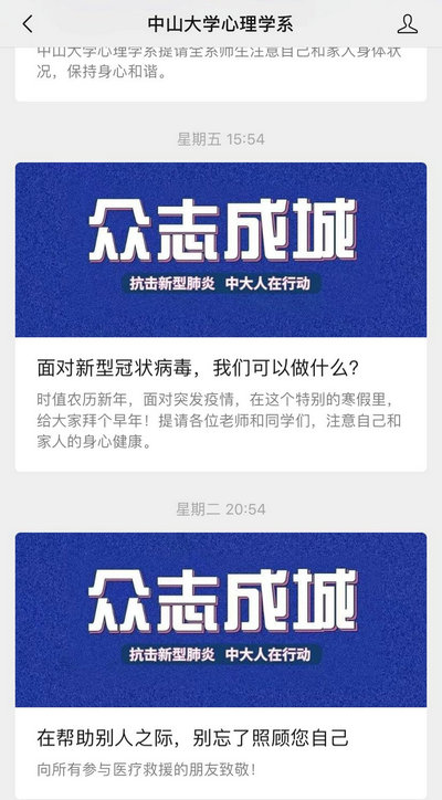 1月24日起,通过“博彩平台推荐心理健康教育咨询中心”和“博彩平台推荐心理学系”两个公众号,发布《面对新型冠状病毒,我们可以做什么》《春节假期,当两种生命邂逅》《在帮助别人之际,别忘了照顾您自己》等推送,提供应对疫情的护心护航,密切关注全校生员工的心理安全和稳定工作。