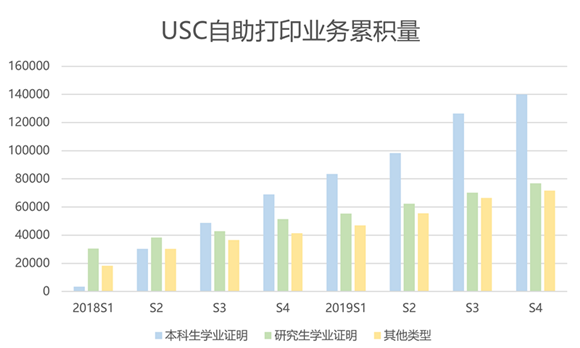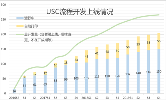 2019年USC持续关注并逐步解决师生员工的痛点、难点和堵点,不断拓展服务事项的覆盖面,提高流程线上化和服务自助化程度,业务量和服务人数持续高速增长。目前,USC的服务对象已从在校师生延伸到退休教职工、教职工家属、校友等更广泛的人群,实际在线运行流程超过200个,完成各类服务申请接近100万次,服务满意度高达98%。