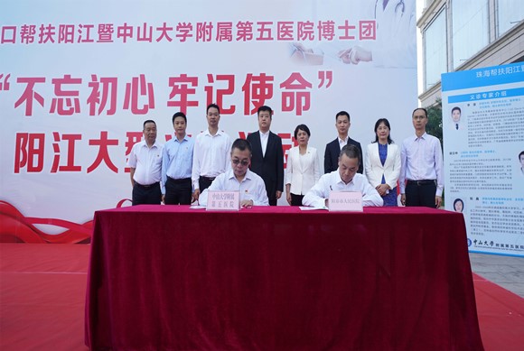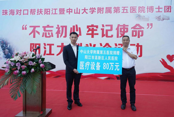 为扎实推进“不忘初心、牢记使命”主题教育,促进优质医疗资源下沉,聚焦为民服务解难题,11月16日至17日,附属第五医院联合珠海对口帮扶阳江指挥部办公室在阳春市举办了“不忘初心、牢记使命”大型义诊活动,与阳春市人民医院签订了医疗合作协议,并向阳江市高新区人民医院捐赠了价值80万的医疗设备。