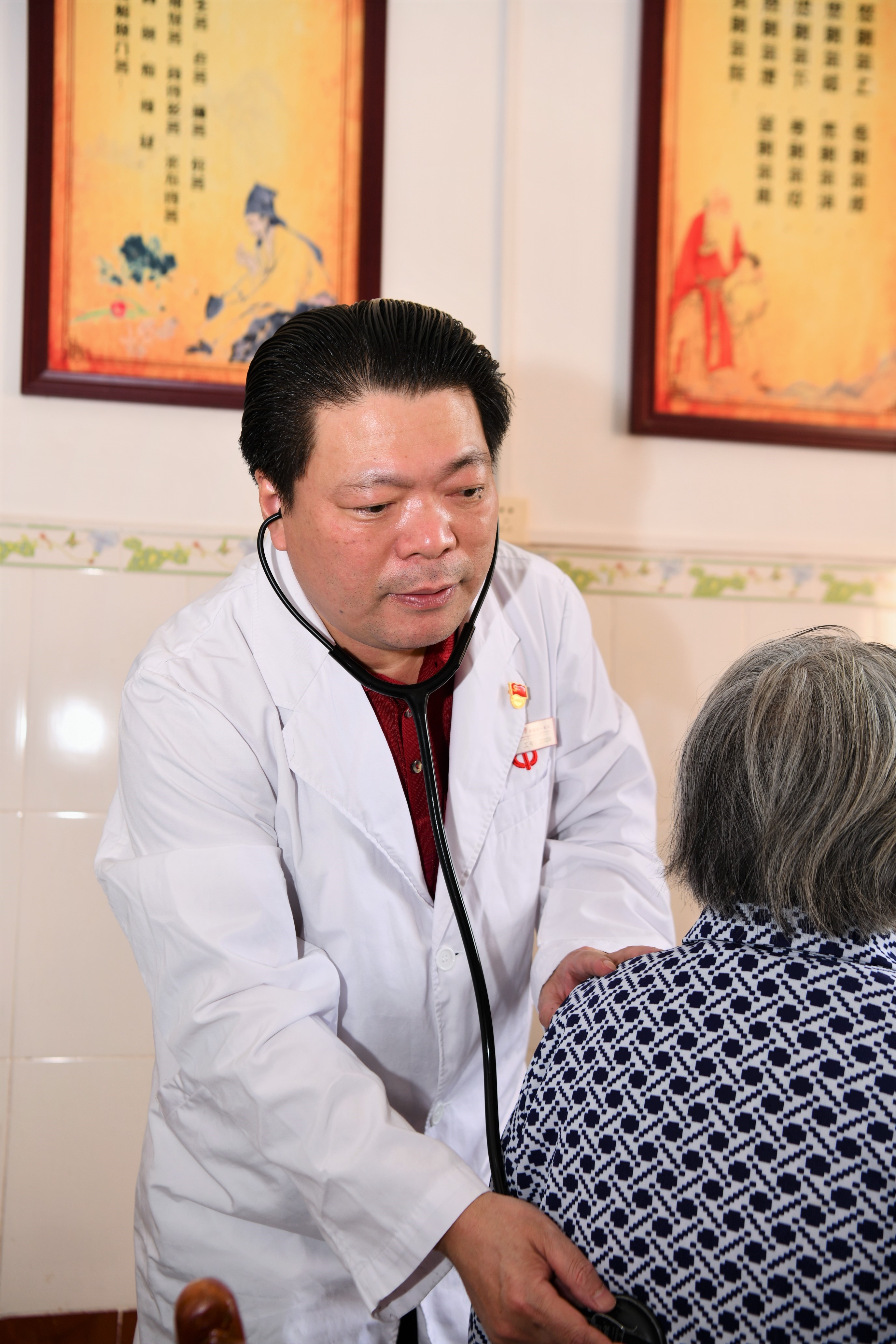拨开人群,只见戴着听诊器的廖教授,问病史、量血压、作体检、写病历,十分耐心细致。有的拿着检查报告来进一步问诊;有的提着大包小包,从外地慕名而来 ……