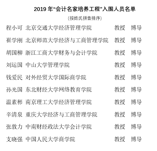 根据财政部、中国会计学会网站公布的消息,2019年“会计名家培养工程”评选工作,经过资格审核、专家通讯评审及专家会议评审等环节,日前已确定入围人员名单。其中,管理学院刘运国教授顺利入围该名单。