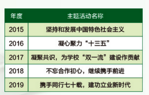 紧扣中央学习实践主题。学校党委紧扣中央每年实践活动主题,深入开展中国特色社会主义理论体系学习,提升思想境界、坚定理想信念,促进认同,在党委统战部的组织下,已连续19年举办党外代表人士研讨班。