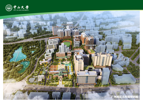 广州校区北校园新的规划由一轴、两带、三庭组成,通过充分利用校园的每一寸空间,提高空间的利用率,改善北校园的教学、科研和生活空间