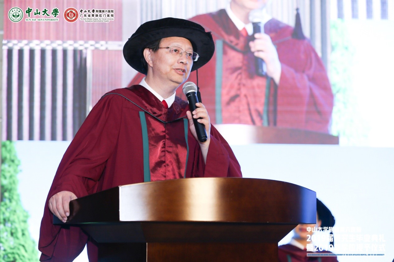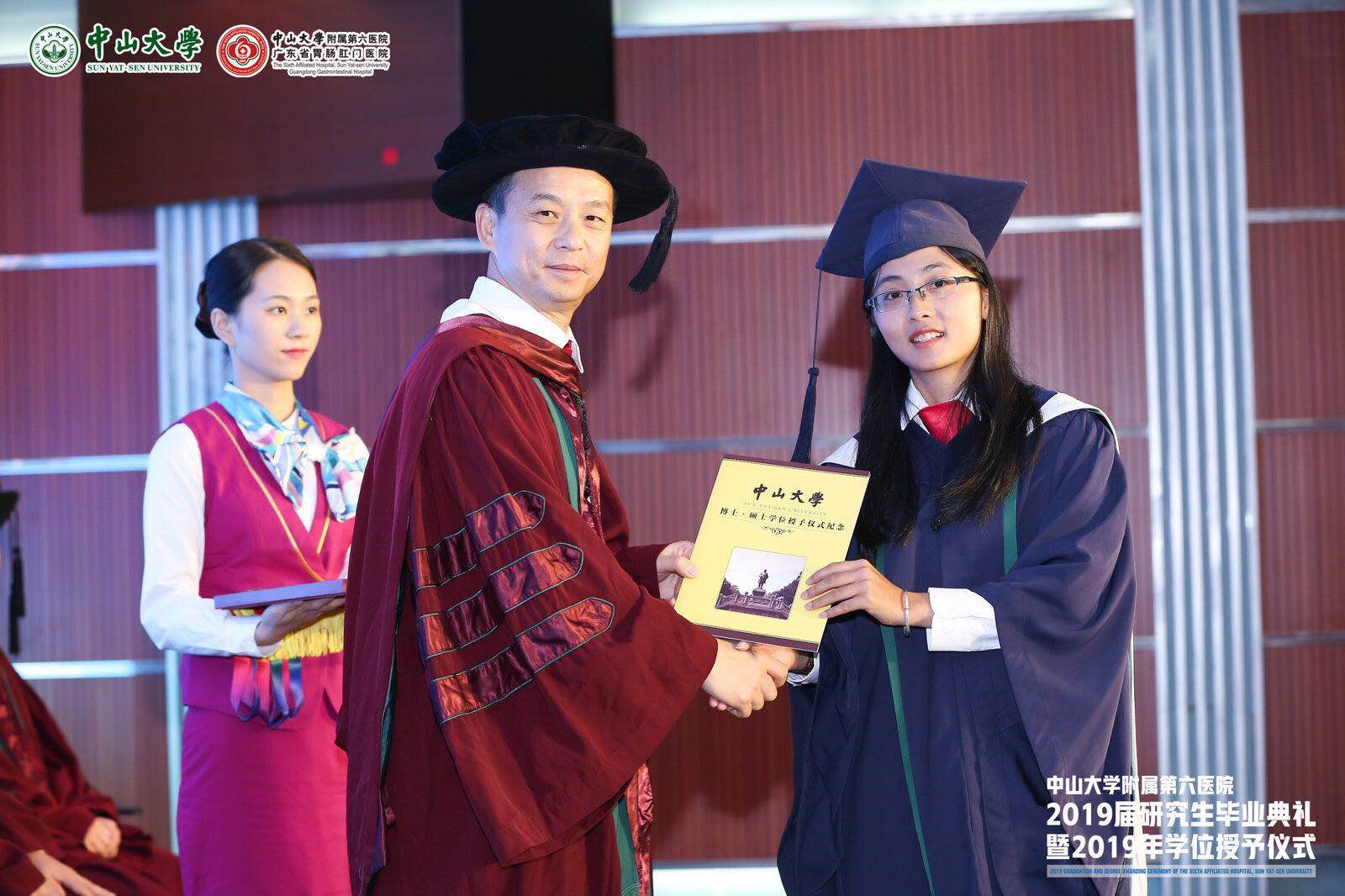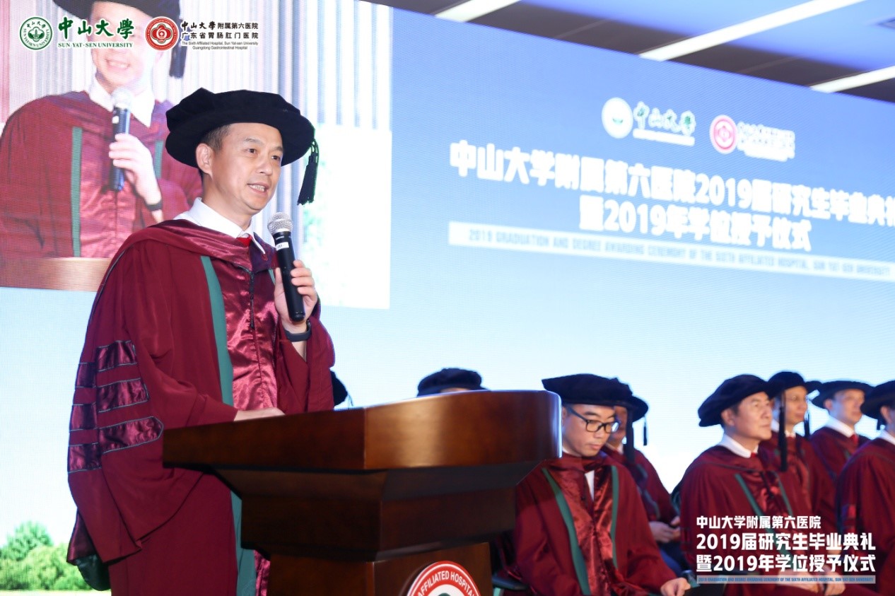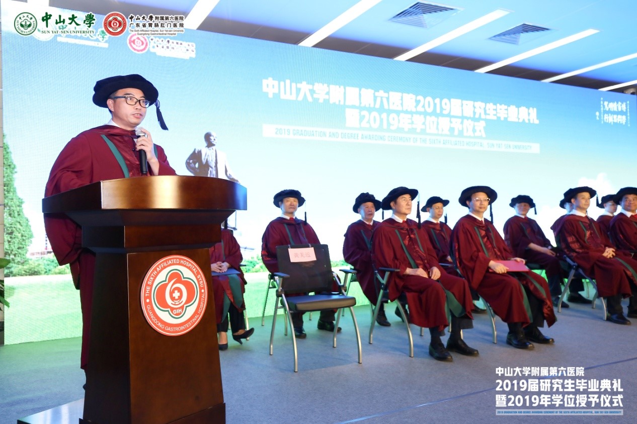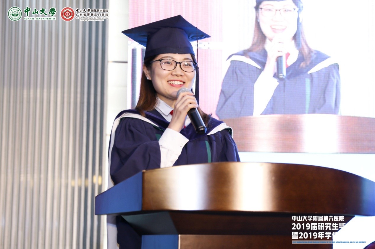 学位授予仪式之后,毕业生代表李洁发言,她代表2019届毕业生表达了对学校、学院的真挚谢意,她回忆了在六院三年度过的时光中,伴随着中山六院的蓬勃发展,2019届的学子也在不断积累着,成长着。研学之路虽苦,学海收获颇丰,我们将时刻谨记“博学、审问、慎思、明辨、笃行”的校训,牢记六院“守真”院训,努力前行,力争有朝一日成为六院的闪光“名片”。