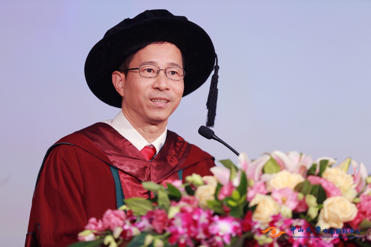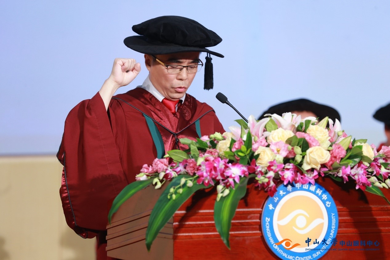 “学海汪洋,毓仁作圣,大学毕业,此其发轫。植基既固,建业立名,登峰造极,有志竟成。为社会福,为邦家光,勖哉诸君,努力自强。”卓业鸿副主任宣读孙中山先生毕业训词,勉励毕业生铭记中山先生教诲,服务国家与人民,肩负起时代赋予的责任与使命。随后,卓业鸿教授宣读了学校学位评定委员会关于授予中山眼科中心硕士、博士学位的决定。