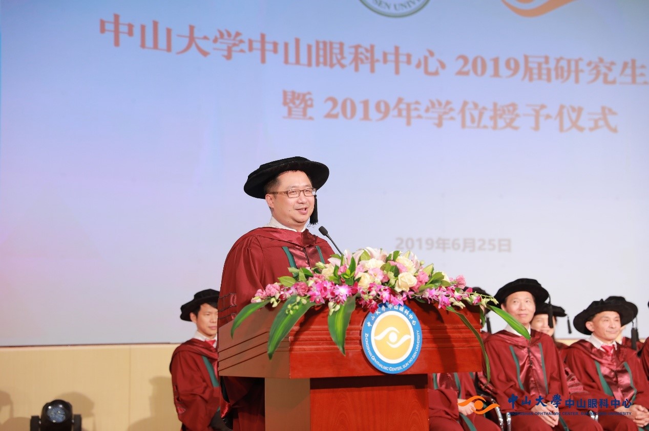 6月25日下午,中山眼科中心2019届研究生毕业典礼暨学位授予仪式在珠江新城院区实验楼学术报告厅举行。中山眼科中心主任、眼科医院院长刘奕志,中心党委书记夏丹,美国国立卫生研究院眼科研究所教授陈之昭以及毕业生的导师和亲友们共同见证了这一神圣时刻。中心副主任、眼科学与视光学系主任卓业鸿主持典礼。