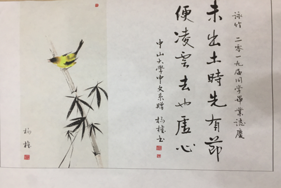 系里还为全体毕业生精心准备了毕业礼物,杨权教授专门为2019届毕业典礼及毕业生创作的字画拓印。画中有坚挺的翠竹与竹上欲飞的黄鹂。竹有节,节节高升,是对毕业生们步步高的祝福;黄鹂终要高飞,是祝福毕业生们终能展翅高飞。 “未出土时先有节,便凌云去也虚心”,表达了他对各位毕业生展翅翱翔的真诚祝福,也道出了希望同学们永记初心,保持气节的谆谆教诲。