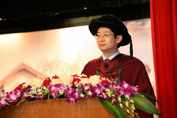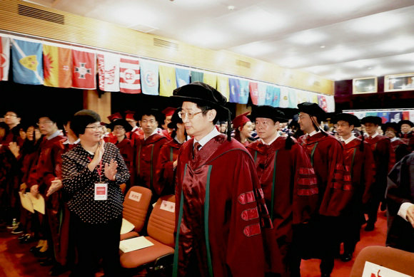 伴随着激昂的校歌和热烈的掌声,陆军教授、黄山书记、张斌教授、李胜兰教授、林江教授、储小平教授、夏南新教授、廖俊平教授、陈宏辉教授等20位主礼教授着导师袍入场并走上主席台就座。