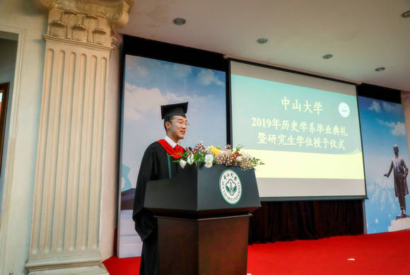 2016级硕士研究生汪舒桐、2015级本科生李正一分别代表研究生和本科生上台发言。汪舒桐在发言中首先代表全体毕业生对传道授业的恩师们表达了真挚的感谢,他回忆了在康乐园学习生活的点滴细节,表达了对未来美好生活的期待。李正一则通过回忆学习生活片段,分享了对学问和对生活的思考。两人不约而同地提及了陈寅恪先生读书治学的名言,表示会在未来的生活中继承和发扬这种追求真理的宝贵精神。