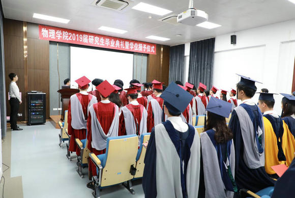 6月22日上午,物理学院举行2019届研究生毕业典礼暨学位授予仪式。物理学院学术委员会主任周建英教授,院长郑跃教授等17位导师代表,33位硕士、博士毕业生参加了学位授予仪式。仪式由董建文教授主持,周建英教授宣读了“博彩平台推荐为物理学院38位硕士34位博士授予学位的决定”,姚道新教授宣读了对优秀研究生论文获得者的表彰决定。