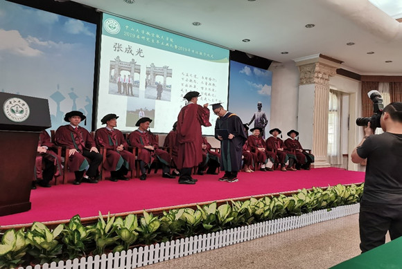 吴志刚院长与获得学位的毕业生逐一握手、颁授学位证书、拨穗,并合影留念。每位毕业生上台时,背景板上播放着该生的个人形象展示投影,使得学位颁授的场面更加具有纪念意义。
