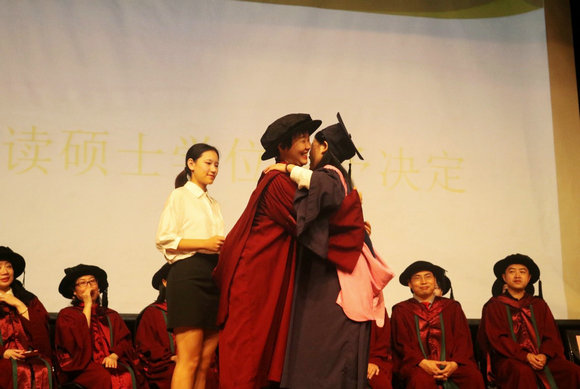 传播与设计学院的研究生导师们为学位获得者逐一拨穗、颁授毕业纪念册。身着学位服的研究生们依次上台受礼,并和导师合影留念。导师与研究生热情拥抱,不少学生眼中闪烁着泪花。面对毕业后即将奔向五湖四海、在不同的岗位上发光发热的学生们,导师们无不流露出由衷的感动与自豪,师生间深厚的情谊与临别的不舍之情感染着在场的每个人。