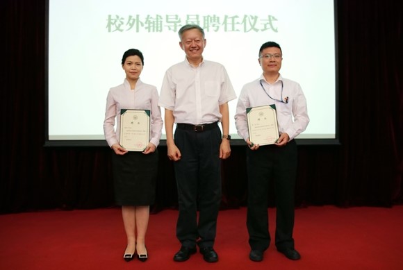 报告开始前,主办方举行了校外辅导员聘任仪式。我校聘任 “全国优秀团干”、广东电网公司团委书记杨志欣,“广州市劳动模范”、广州荔湾供电局副局长熊俊两位同志为校外辅导员,陈春声书记为他们颁发了聘书。