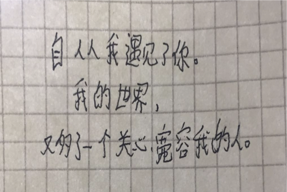 令我出乎意料、感动不已的是,我们班最调皮的男孩子写了一首三行诗给我——“自从我遇见了你/我的世界/又多了一个关心宽容我的人”。