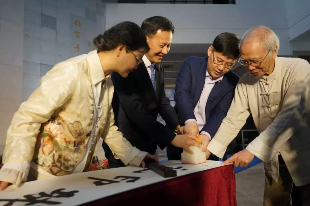 吟唱毕,陈永正教授、肖海鹏副校长、彭玉平主任、郭文兰校友上台,为陈永正教授的书法题词“花城印记”盖上中文系玉印,共同启动“花城印记”诗词大赛。