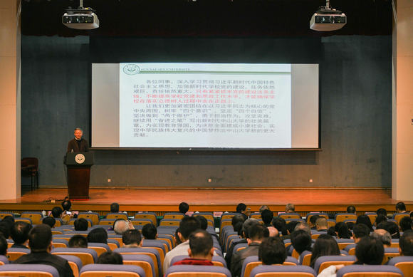 陈春声书记作题为《改进高等教育管理方式 健全立德树人落实机制 提高学校党的建设和思想政治工作水平》的大会报告。他指出,2019年是中华人民共和国成立70周年,是决胜全面建成小康社会的关键之年,学校要进一步贯彻落实全国教育大会精神,贯彻落实2019年全国教育工作会议部署,加强党的全面领导,落实立德树人根本任务,深化实施办学综合改革,提升科学管理水平,加快构建与“双一流”建设相匹配的运行机制和管理机制。他强调,学校要进一步加强基层党建,坚决做好意识形态工作;要进一步健全立德树人落实机制,严格学生教育管理;要进一步加强高水平教师队伍建设,严抓落实师德师风建设长效机制;要进一步压实院系办学主体责任,严肃问责追责;要进一步坚持底线思维,切实维护校园安全稳定。他强调,全校教职员工必须深入学习贯彻习近平新时代中国特色社会主义思想,更加紧密团结在以习近平同志为核心的党中央周围,树牢“四个意识”,坚定“四个自信”,坚决做到“两个维护”,落实新时代党的建设总要求,不断提高学校党建和思政工作水平,牢固树立“万无一失、一失万无”的工作理念,增强风险意识、底线思维,确保2019年学校部署的各项重点工作任务切实落到实处、取得实效。