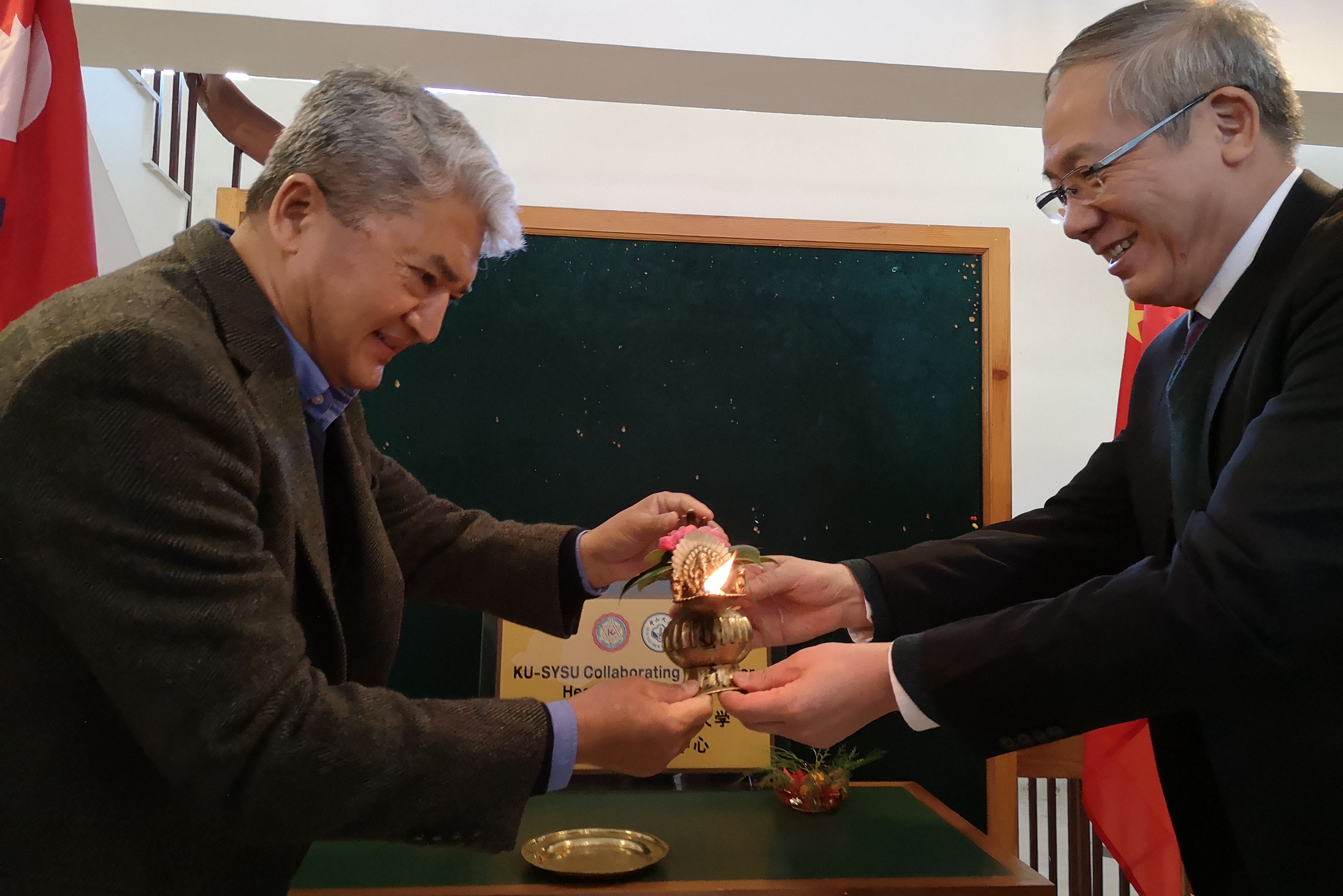 罗俊校长与Ram Kantha Makaju Shrestha校长以点灯仪式为“加德满都大学—博彩平台推荐卫生发展研究中心”揭幕