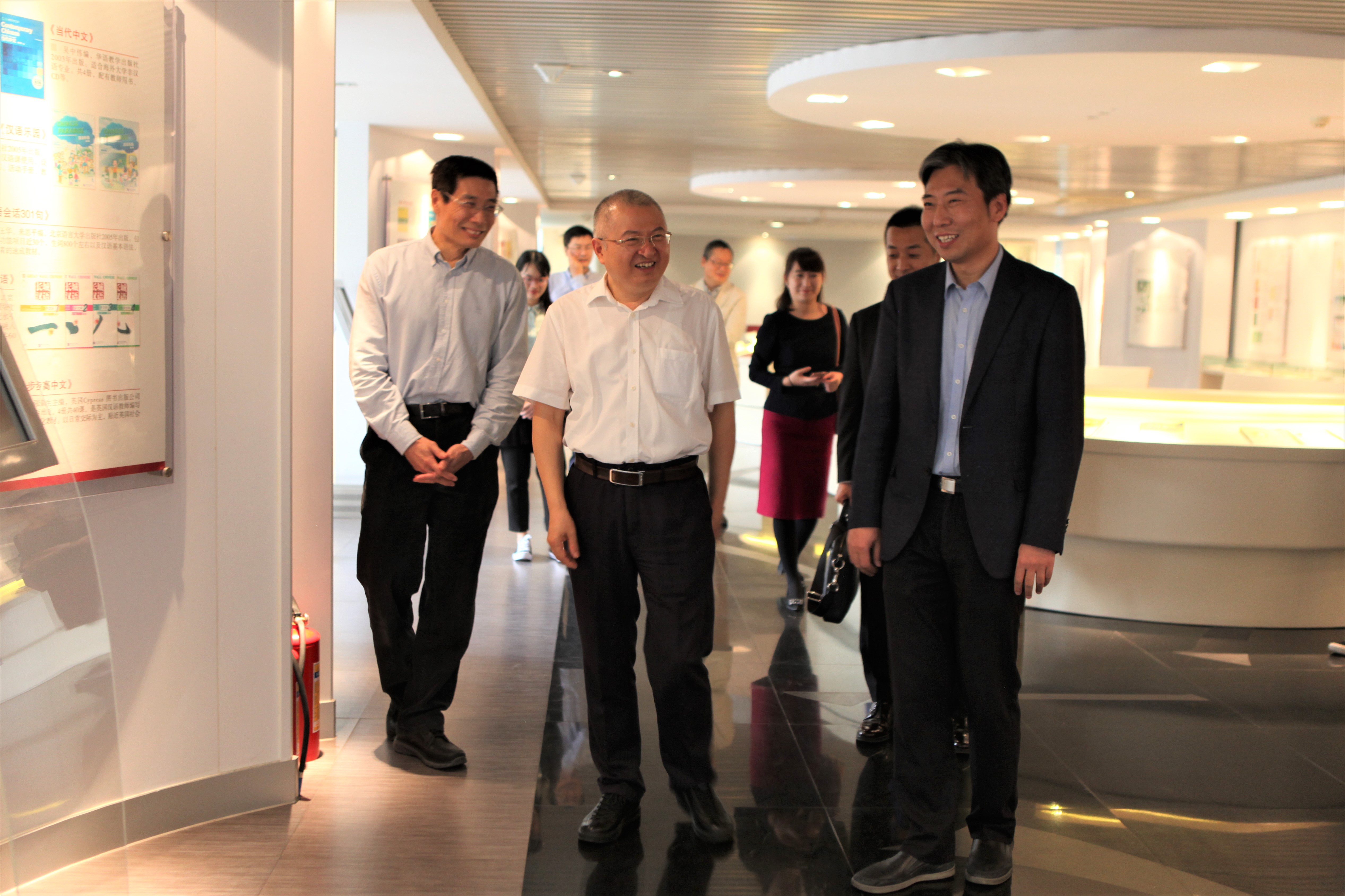 调研期间,李善民副校长陪同郁云峰副主任参观了基地全球汉语教材信息展示中心。基地主任周小兵教授讲解了汉语教材的发展历史,介绍并展示了基地收录的古今中外经典汉语教材。郁云峰副主任对基地为收集、整理汉语教材所做的工作给予了高度评价。