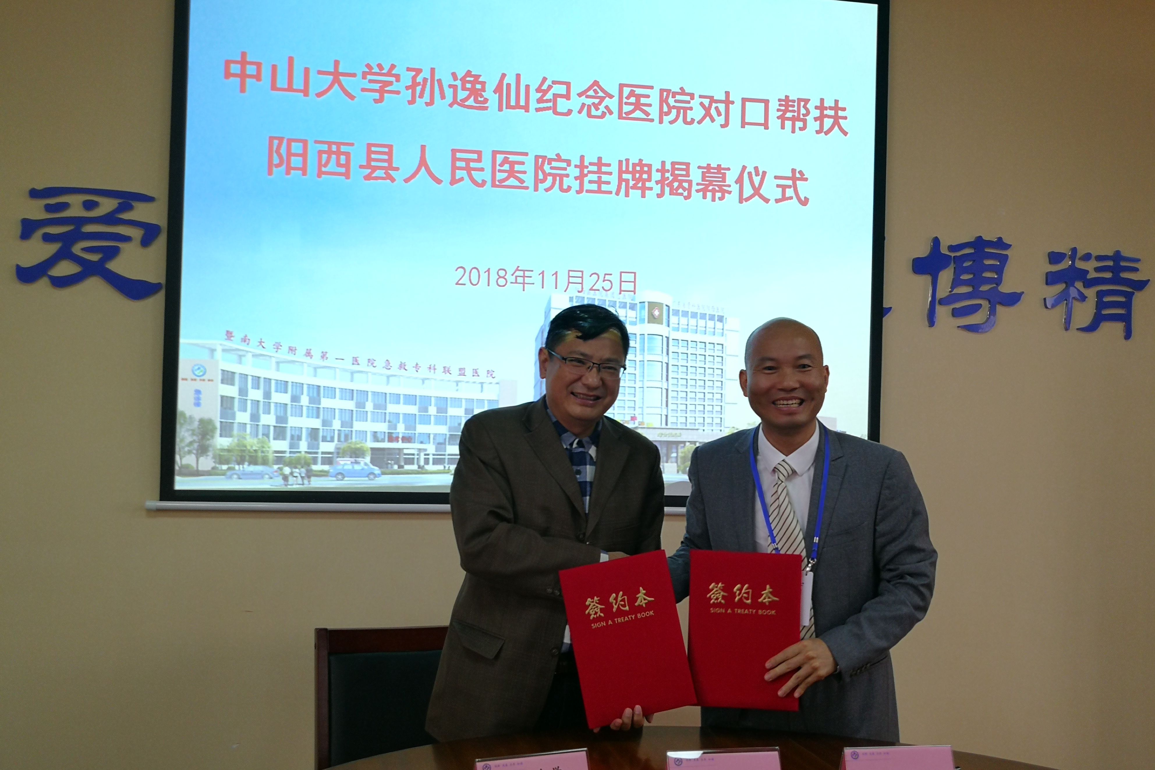 当天早上,阳江市卫生和计划生育局副局长关华勋副局长、阳西县卫计局陈俊华局长、阳西县人民医院洪家文院长带领院领导班子及全院中层干部、业务骨干参加了签约揭牌仪式。会议由陈俊华局长主持。孙逸仙纪念医院刘超副院长与阳西县人民医院洪家文院长现场签订了帮扶工作协议书,并与关华勋副局长、陈俊华局长一同为“对口支援医院”挂牌揭幕。