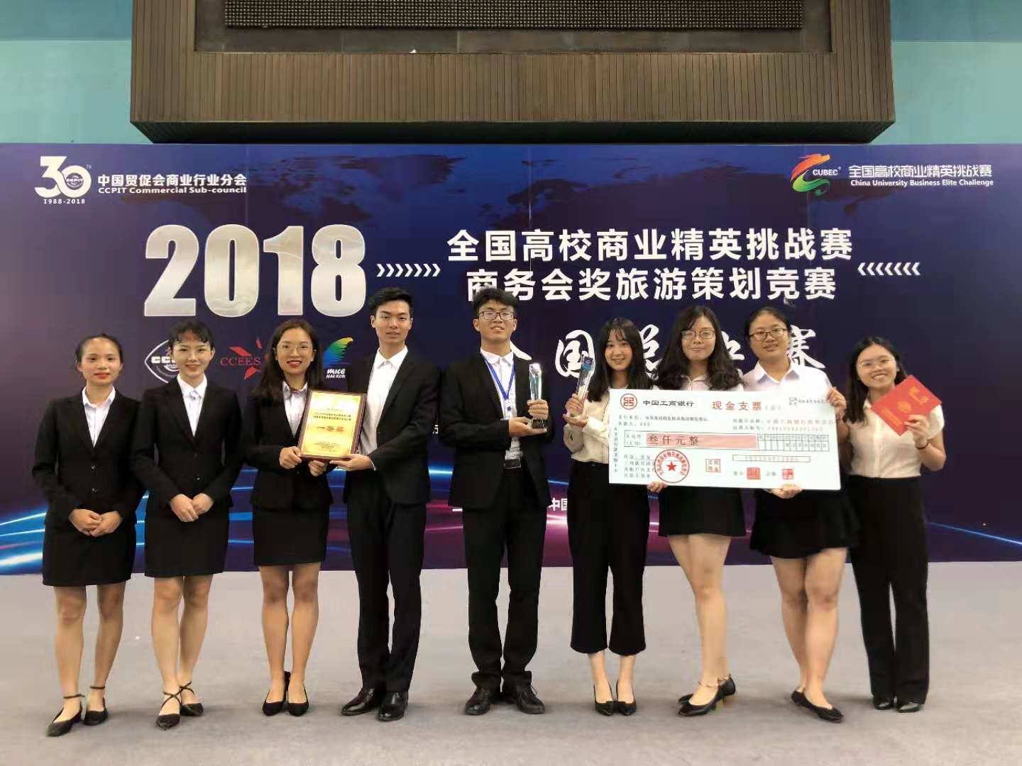 本届商务会奖旅游策划竞赛共有高等院校34所,参赛团队105支,共计600余人参加现场总决赛。我校旅游学院参赛队获得全国总冠军、全国总季军、全国第四名的好成绩。其中冠军队由伍晓琳、任宇洁、邹芝丹、曹轶涵、黄嘉宝等六名本科生组成,指导教师卓友森老师,郭梓岩、卫杰、姚丽思、贲国娇、蔡佳琪等五名本科生组成的团队获得了季军,指导教师张辉副教授。