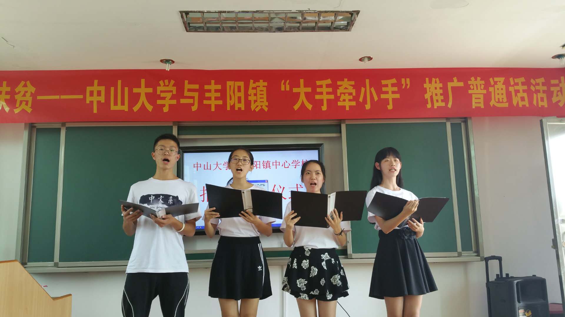 与此同时,我校出版社、孙逸仙纪念医院、校扶贫工作组、驻村工作队、中文系和资讯管理学院32名师生,在共青团连州市委员会、丰阳镇领导同志的陪同下,赴丰阳镇中心校开展“大手牵小手”普通话推广活动。我校出版社、扶贫工作组代表学校为丰阳镇中心校捐赠758册价值一万五千元的书籍,孙逸仙纪念医院捐赠一台钢琴。丰阳镇中心学校校长代表学校接受捐赠,并对我校以普通话推广活动为契机开展的教育扶贫表示肯定和感谢。捐赠仪式后,中文系、资讯管理学院以及丰阳镇中心学校相关人员进行了节目表演。全体人员还集体参观了我校精准扶贫柯木湾村的宽体金线蛭养殖产业项目。