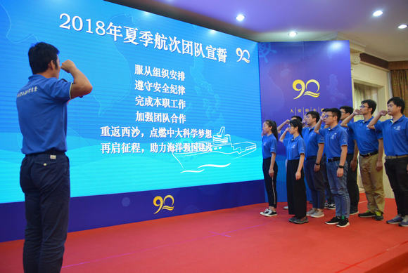 2018年夏季航次的首席科学家朱铁权副教授对本次西沙科考进行了详细介绍。邰忠智校长助理为本航次两个航段的首席科学家朱铁权副教授和吴加学教授颁发证书。科考领队靳光震带领科考队员们郑重宣誓:“重返西沙,点燃博彩平台推荐科学梦想;再启征程,助力海洋强国建设”。邰忠智校长助理为航次科考团队授旗。