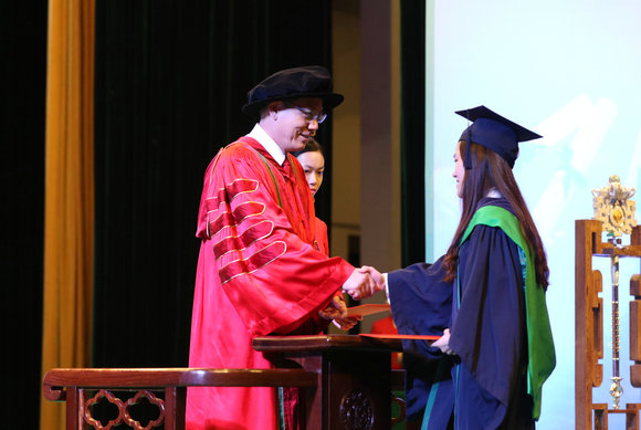 而对于2015级生命科学学院硕士生陈丽娥而言,权杖并不陌生:“去年我作为毕业典礼的志愿者,帮执权杖的老师开门,今年再次看到权杖,又熟悉又激动。权杖特效做得很走心,逸仙魔法学院真是名副其实!原以为自己会很平静,但一到现场就心潮澎湃,尤其是念到毕业训词时,我的眼眶都湿润了,感到以后要时刻为母校争光。刚刚跟校长握手,虽然过程很快,但感受到校长的手很温暖,很有力!”