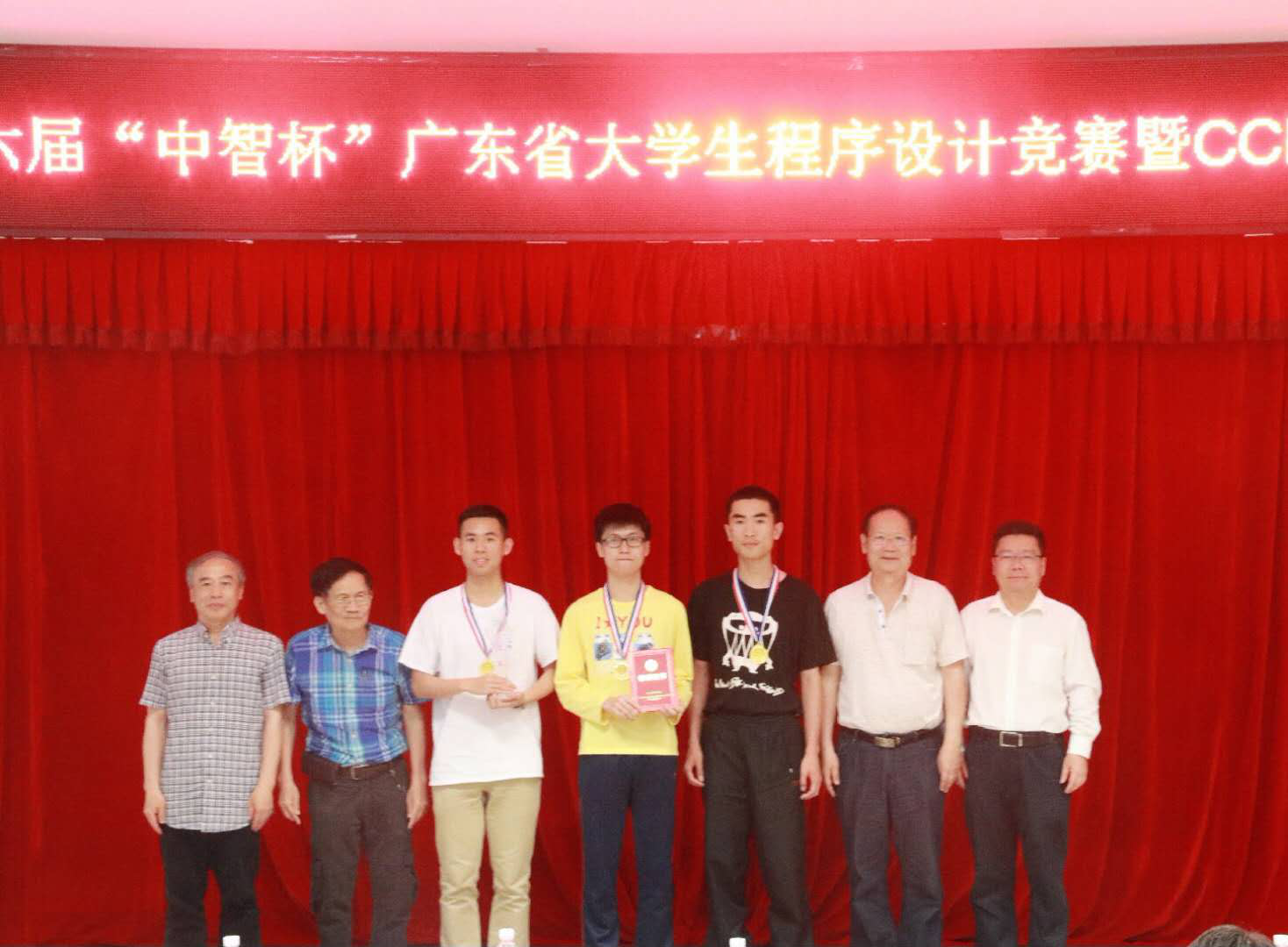 博彩平台推荐学子获第16届“中智杯”广东省大学生程序设计竞赛冠军颁奖现场,从左到右是刘财兴教授、郭嵩山教授、王凯祺同学、黄镇同学、范俭豪同学、黄轩秘书长、王振宇院长。