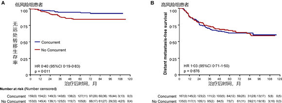 那么,这一发现对临床有什么指导意义呢?令人兴奋的是,本项研究还发现,利用这组分子标签可以区分鼻咽癌患者同期化疗获益人群。对于低转移风险组的患者,其可以从接受同期化疗中获益, 5年远处转移率从16%降低至5%;而高风险组患者则无显著改善(图3),提示这部分患者可能需要进一步强化治疗,例如诱导化疗,或者联合靶向药物甚至免疫治疗等,有待进一步研究证实。