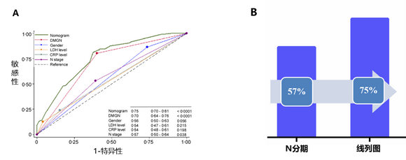 那么,这一13基因构成的分子标签(DMGN)与鼻咽癌传统预后指标相比效果如何呢?研究团队采用ROC对指标的敏感性和特异性进行综合评价,发现单纯临床N分期预测远处转移的准确性仅为57%;将分子标签与N分期等临床指标相结合构建鼻咽癌远处转移线列图(Nomogram,图4),则能够将预测准确性由57%提高至75%(提高了18%,图5)。(该项研究结果在佛山市第一人民医院、桂林医学院附属医院的患者样本中均得到了验证)