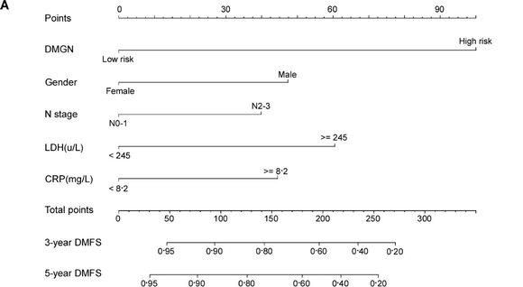 图5. DMGN和临床指标构建的列线图可提高鼻咽癌患者远处转移风险预测的准确性
