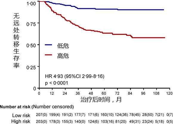 针对上述情况,马骏教授团队开展了现今国际最大规模的鼻咽癌分子标志物研究,团队通过表达谱芯片对接受治疗后有无出现远处转移的鼻咽癌组织全基因组表达水平进行对比分析,从数万个基因中初步锁定137个差异表达基因,再用回归分类器的统计方法从410例患者中筛选13个远处转移相关的基因构建分子标签,将病人分为高风险组和低风险组。结果显示,高风险组患者5年远处转移率高达37%,低风险组则仅为9%(图2)。
